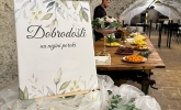 - Organizacijo poroke: manjša dekoracija, postavitev prostora, stolov in stoječih miz, povezovanje z lokalnimi glasbeniki in fotografi.